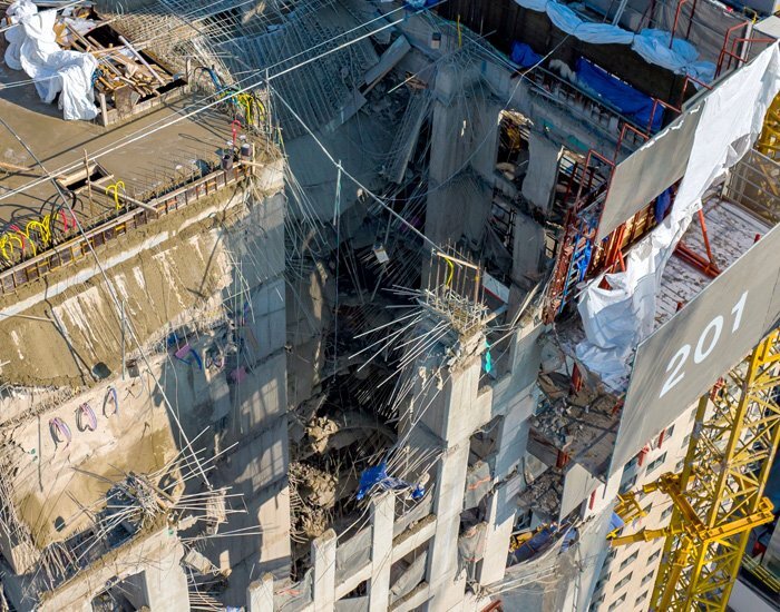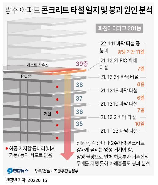 현재 붕괴현장에서 반출되고 있는 건축물의 잔해를 본다면 콘크리트 양생 작업에 충분한 시간이 주어지지 않았음을 짐작해볼 수 있다.