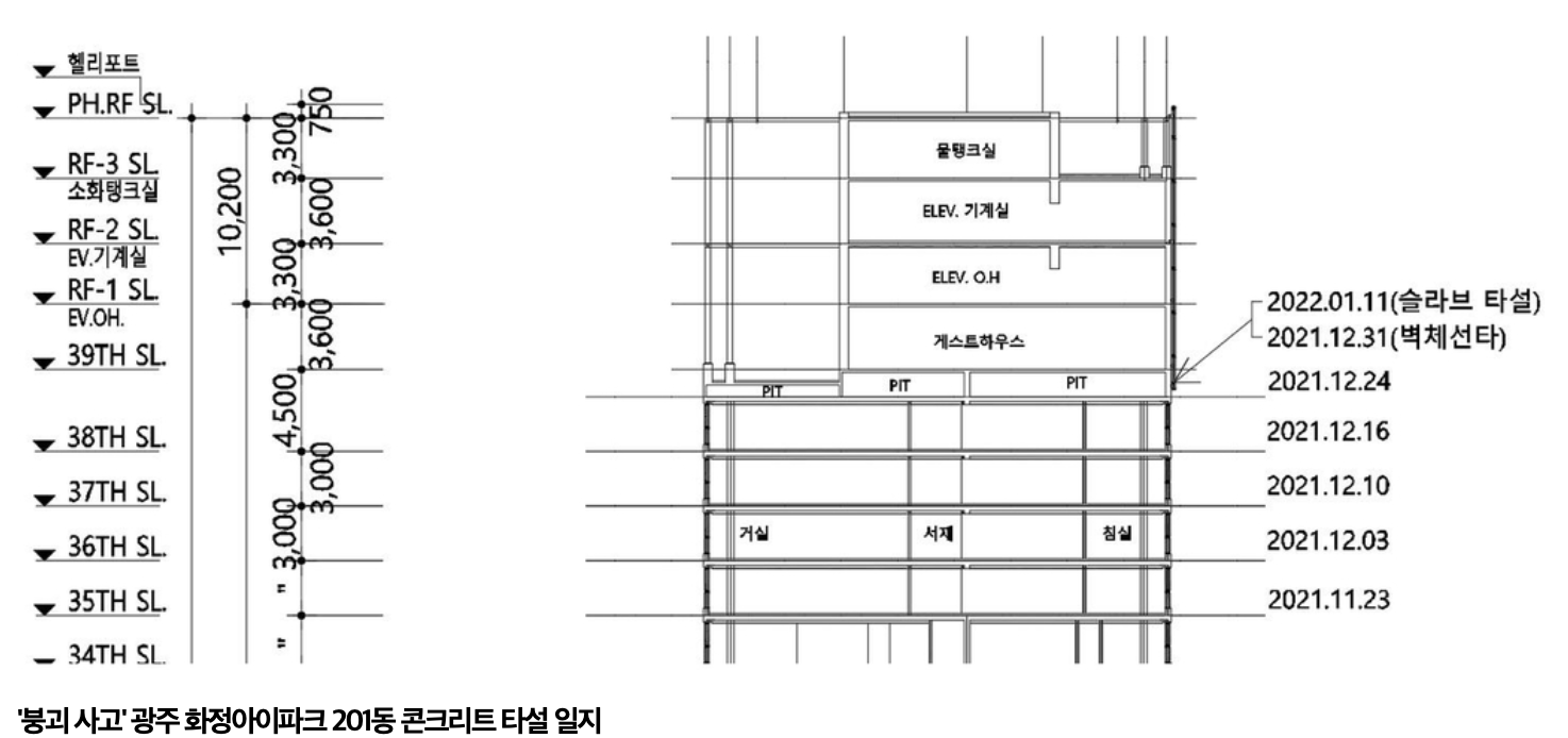 일지에 따르면 21년 12월 3일에 35층부터 37층까지 콘크리트 타설을 진행하는데 소요된 기간은 13일에 불과했다.