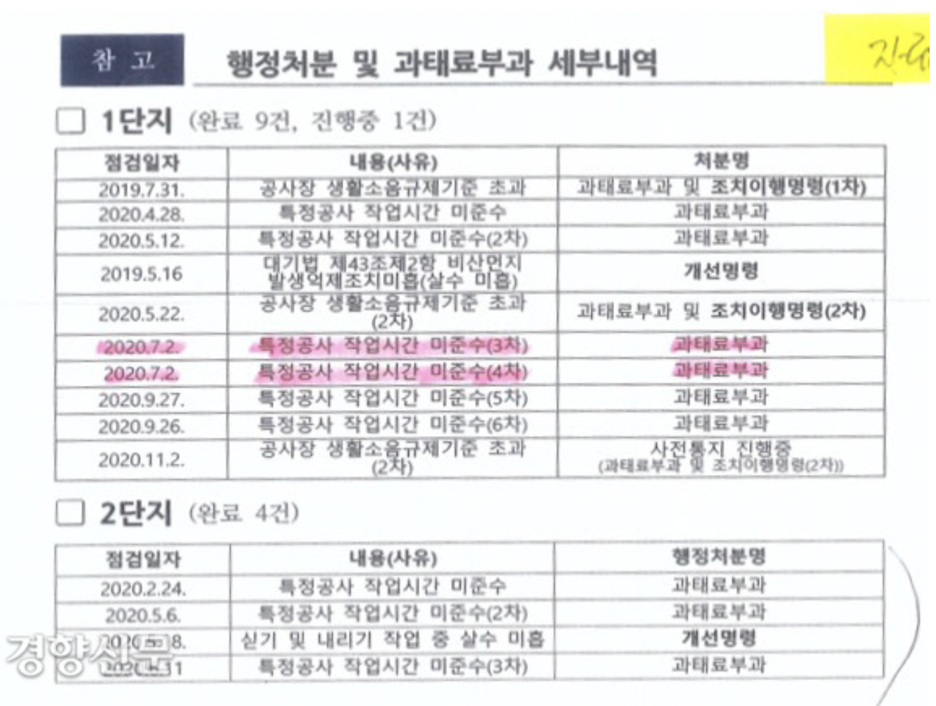 또한, 공사현장 중 1단지에서 10건의 위법행위가 2단지에서도 4건의 불법이 확인되어 행정처분을 받기도 했는데 이러한 불법 행위로 인해 과태료가 결정된 사안만 해도 12건에 달한다.