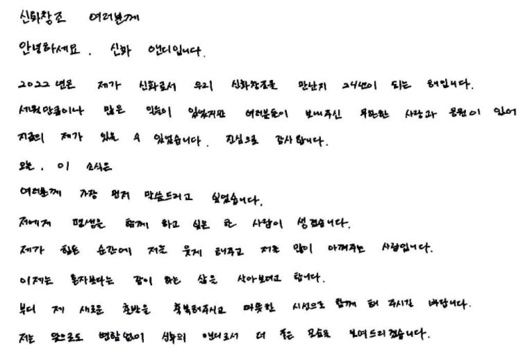 자필 편지에는 "2022년은 제가 신화로서 우리 신화창조를 만난 지 24년이 되는 해다. 세월만큼이나 많은 일들이 있었지만 여러분들이 보내주신 무한한 사랑과 응원이 있어 지금의 제가 있을 수 있었다. 진심으로 감사하다."라고 말하며 감사 인사를 먼저 올렸습니다.