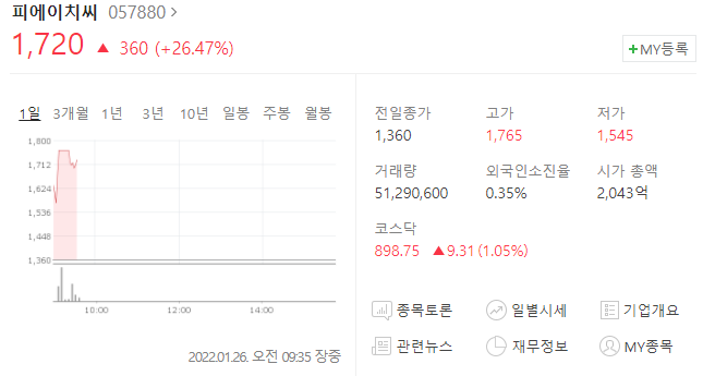 피에이치씨의 주가가 장 초반부터 급등(거의 상한가 직전) 하고 있다.