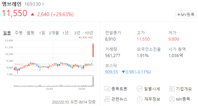 엠브레인의 주가가 장 시작하자마자 상한가를 기록하였다.