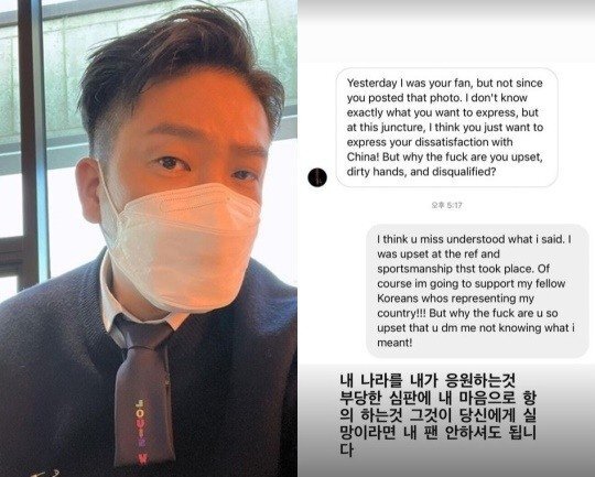 MC몽의 소신 발언으로 인해 한 누리꾼이 "나는 어제까지만 해도 당신 팬이었지만 당신이 그 게시물을 올린 순간부터는 아니다. 당신은 그냥 중국에 대한 불만을 표하고 싶었던 것 아니냐"고 따져 묻자 MC 몽은 "내 나라를 내가 응원하는 것. 부당한 심판에 내 마음으로 항의하는 것. 그것이 당신에게 실망이라면 내 팬 안 해도 된다"고 응수했다.
