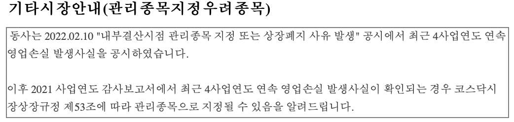 참고로 코스닥기업에는 4년 연속 개별 영업손실을 기록하면 관리종목으로 지정되며 5년 연속으로 이어지면 상장폐지 사유가 된다.