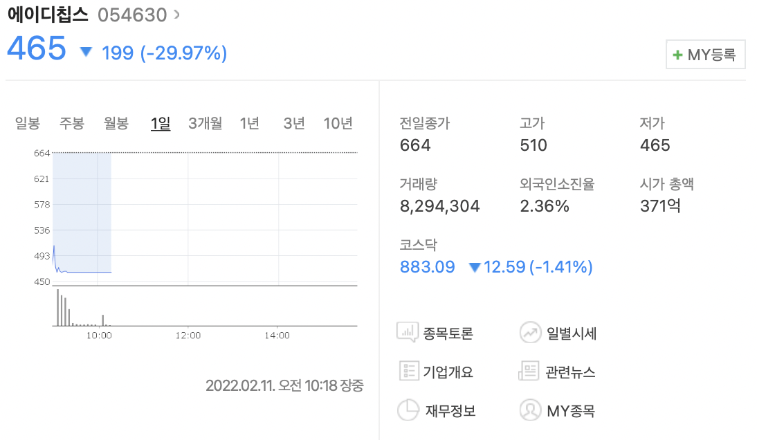 전날 한국거래소 코스닥시장본부는 에이디칩스에 대해 최근 4사업연도 연속 영업손실 반생에 따른 관리종목 지정 우려로 장종료 시까지 주권매매거래를 정지한다고 공시했다.