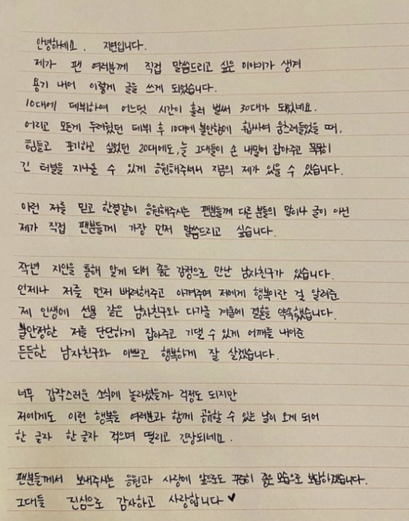 지연은 10일 오후, 개인 인스타그램 계정을 통해 팬들에게 손편지를 공개하며 결혼을 발표하였습니다.