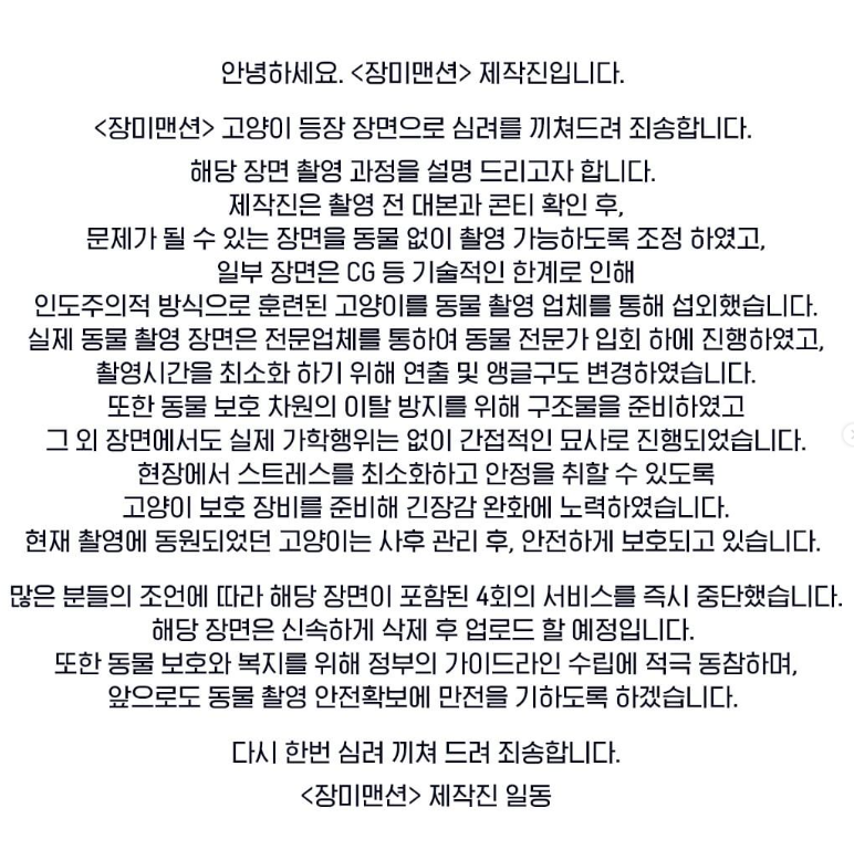 장미맨션 측이 길고양이 학대 장면에 대해 사과하고 동물 촬영 시 안전을 약속했다.