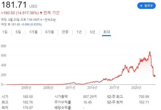 물론 다른 빅테크기업들도 2~30% 하락한 상황이지만 넷플릭스는 70% 하락한 것이다.