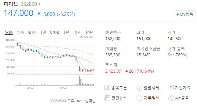 하이브 주가 147,000원(-3.29%)