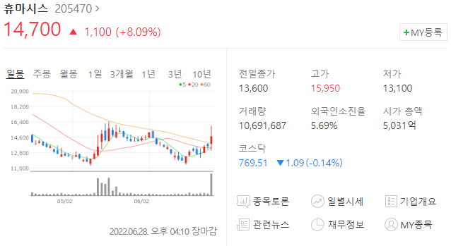 휴마시스 주가 14,700원(+8.09%)