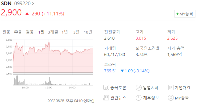 SDN 주가 2,900원(+11.11%)