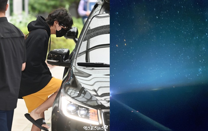 검은 후드티에 노란 반바지, 편안한 슬리퍼 차림으로 등장한 뷔는 문이 열리자마자 빠른 걸음으로 차량에 탑승했다.