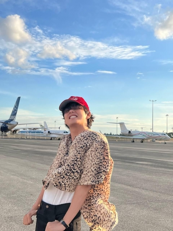 공개한 사진에는 밤하늘을 수놓은 아름다운 별과 공항에서 포즈를 취하고 있는 뷔의 모습이 담겨있었다.