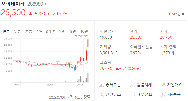 모아데이타는 보통주 1주당 신주 5주를 배정하는 무상증자를 결정했다는 공시와 함께 좋은 흐름을 보여주고 있다.