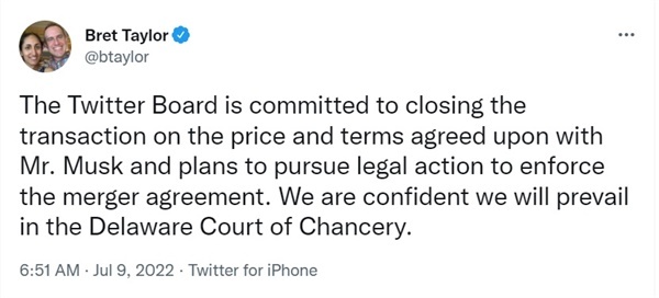 그는 자신의 트위터에 "트위터 이사회는 머스크와 합의한 가격과 조건으로 거래를 마무리하기 위해 최선을 다하고 있으며 인수 계약을 시행하기 위한 법적 조치를 취할 계획이다. 우리는 델라웨어의 법원에서 우리가 승리할 것이라고 확신한다"라고 밝혔다.
