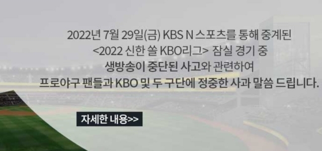 KBS N은 "경기 중 생방송이 중단된 사고와 관련해 프로야구 팬들과 KBO 및 구단에 정중한 사과 말씀을 드린다"고 전했다.