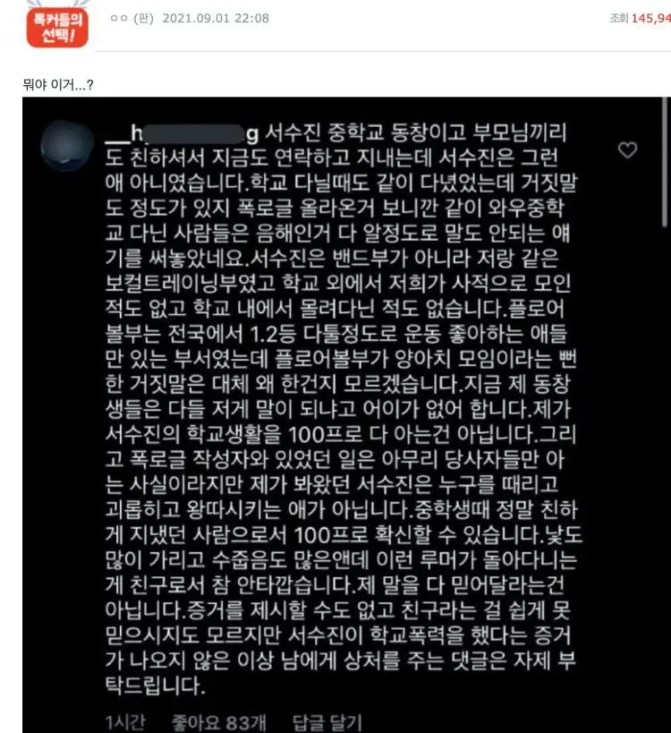 "서수진은 중학교 시절 불미스러운 일에 연류되어 경솔한 언행으로 다른 학생들과 불화가 있었지만, 결코 학교폭력에 해당하는 행위를 한 사실은 없다는 것"이라고 덧붙였다.