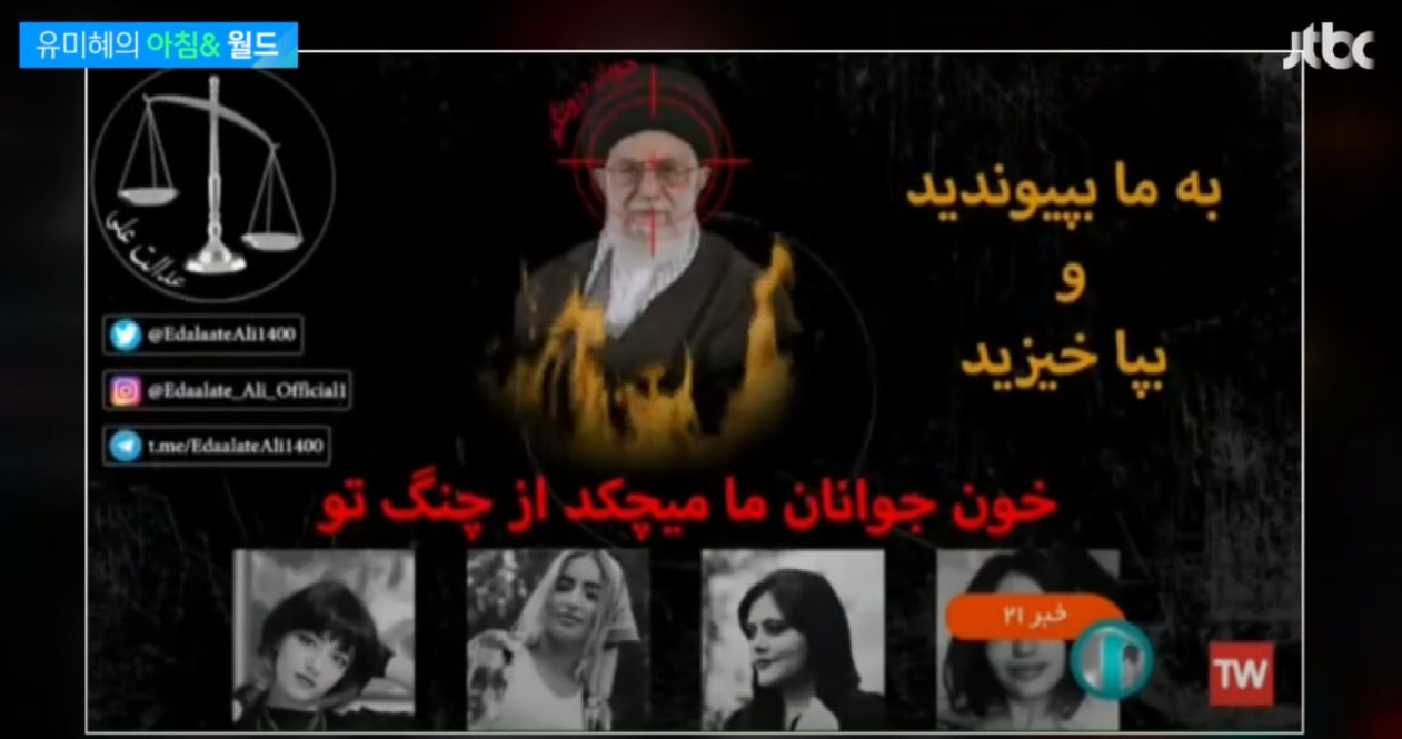 영상 속에는 이란 최고지도자인 아야톨라 세예드 알리 하메네이가 불길에 휩싸이고 표준으로 조준되는 이미지와 최근 반정부 시위를 촉발한 인물인 마흐사 아미니의 흑백 사진이 담겨있었다.