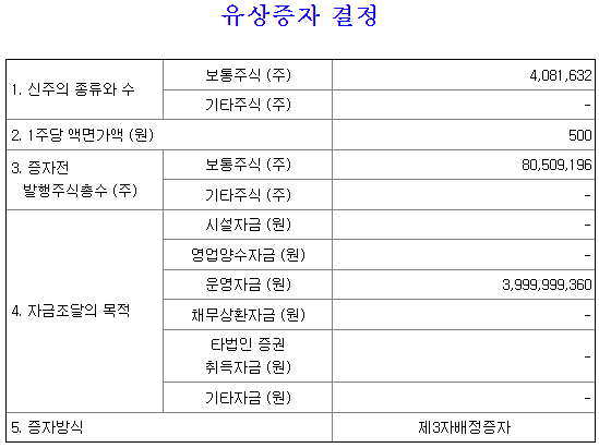 공시에 따르면 보통주 408만 1632주가 신주로 발행되며 신주 발행가액은 980원이다.
