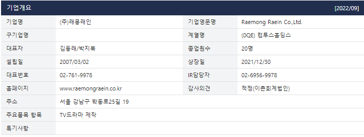 래몽래인은 2007년 3월에 설립되어 드라마 제작을 주 사업으로 영위하고 있으며, 2021년 12월 코넥스에서 코스닥으로 이전 상장한 회사이다.