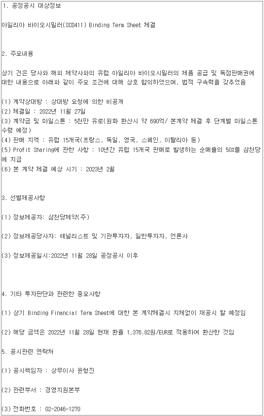 삼천당제약/수시공시의무관련사항(공정공시)/2022.11.28