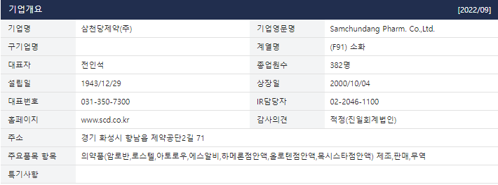 삼천당제약은 1943년 12월 의약품 제조 및 판매를 사업목적으로 설립, 향남제약단지 소재에 KGMP 공장을 준공하여 항생제, 순환기질환 치료제, 소화기질환 치료제, 안약류 등을 생산하는 회사이다.