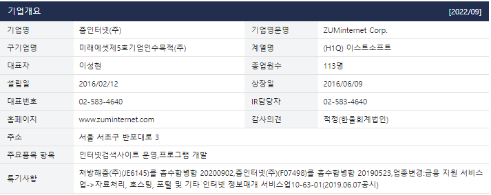 2019년 5월 미래에셋 제5호 기업인수목적주식회사에 흡수합병한 뒤 상호를 줌인터넷으로 변경하였다.