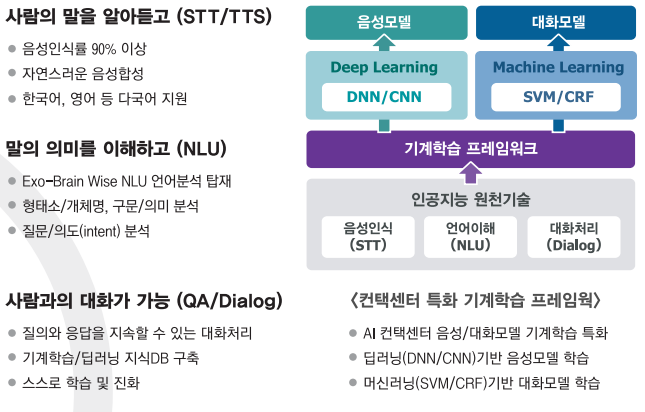 음성봇, 챗봇을 활용한 다양한 비즈니스 환경을 제공하여 고객에게는 편리하고 기다림 없는 서비스를 통해 고객경험을 차별화하고 고객의 질의 분석을 통해 전문상담사를 연결하고 간단한 상담이나 거래성 업무 등을 대기 없이 바로 처리할 수 있는 최적의 환경을 제공한다.