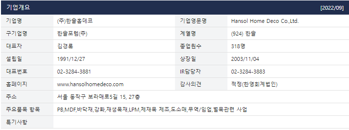 한솔홈데코는 1991년 12월에 설립되어 중밀도섬유판(MDF) 및 기타 나무제품 제조/판매, 도매 등을 주요 사업으로 영위하고 있는 회사이다.