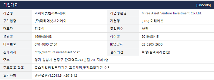 미래에셋벤처투자는 1999년 6월 설립되어 중소기업 창업자에 대한 투자 및 중소기업 창업투자조합자금 관리 등을 주요 사업으로 영위하는 벤처캐피탈 업체이다.