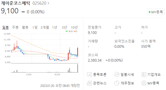 이에 어제 강한 상승을 보여준 화장품 관련주 제이준모스메틱