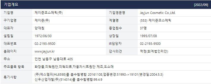 주요 제품은 마스크팩 및 기초화장품 등으로 (주)에프앤리퍼블릭 등을 주요 거래처로 보유하고 있으며, 인천 남동구에 공장을 운영하고 있다.