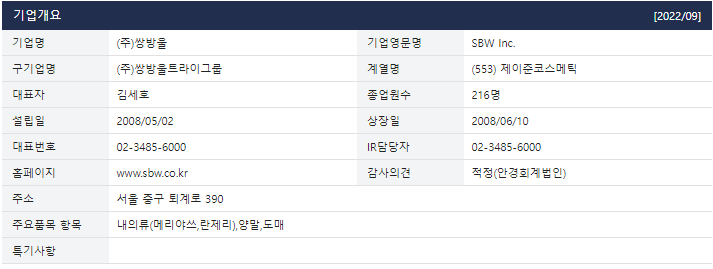 쌍방울은 2008년 05월 (주)티이씨앤코의 내의류 및 의류사업부문을 인적분할하여 설립되었으며 섬유류(내의류, 의류)의 제조 및 유통업을 영위하고 있는 회사이다.