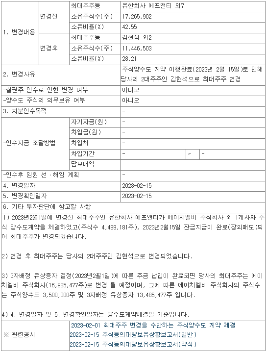 공시에 따르면 변경전 최대주주인 유한회사 에프앤티가 에이치엘비 주식회사 외 1개사와 주식 양수도계약을 체결하였고(주식수 449만 9181주), 2023년 2월 15일 잔금지급이 완료(장외매도)되어 최대주주가 변경되었다고 밝혔다.