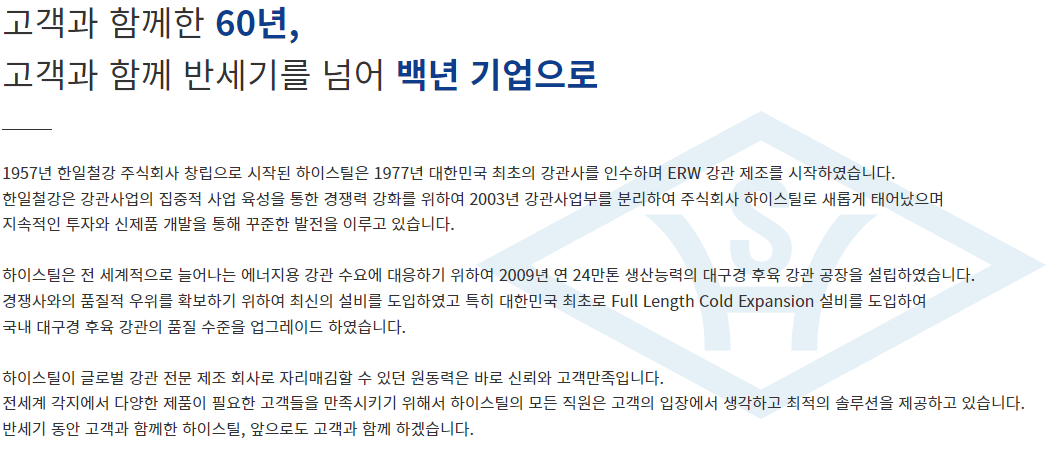 미국 및 북미 지역 판매를 위한 HISTEEL PIPE & TUBE INC. 와 열처리 업체인 하이파워를 종속기업으로 두고 있으며, 국내 강관산업은 (주)세아제강, 현대제철(주), 넥스틸(주), (주)휴스틸 등을 비롯한 40여 개의 업체가 완전경쟁시장을 형성하고 있다.