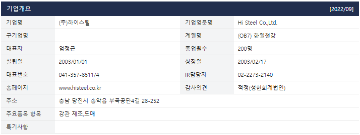 하이스틸은 2003년 1월 한일철강(주)의 강관류 사업부문이 인적분할되어 설립되었으며, 충남 당진에 본사 및 공장, 인천공장, 함안공장, 서울사무소, 부산사무소, 광주사무소를 두고 있는 회사이다.