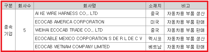 현재 중국현지 생산법인(문등), 판매법인(위해)과 물류창고(상해), 미국 현지 판매법인과 창고(임대)를 보유하고 있으며, 북미 시장의 확장을 위하여 Mexico 에 현지 제조공장을 설립하여 가동하고 있다 멕시코 공장의 경우 2019년부터 양산을 시작하였으며, 자동차용 와이어링하네스와 LED Module 을 생산하고 있으며, 사출공장까지 보유하고 있다.