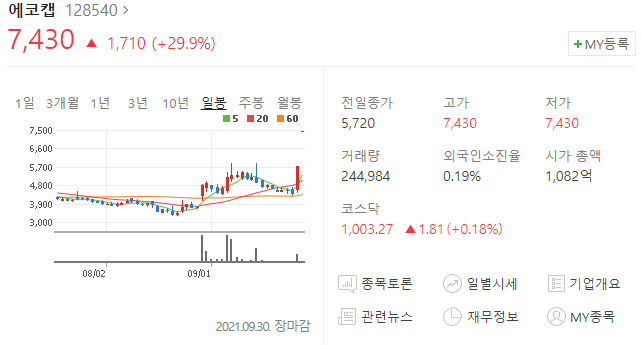 에코캡 주가가 연일 상한가를 이어가고 있다.