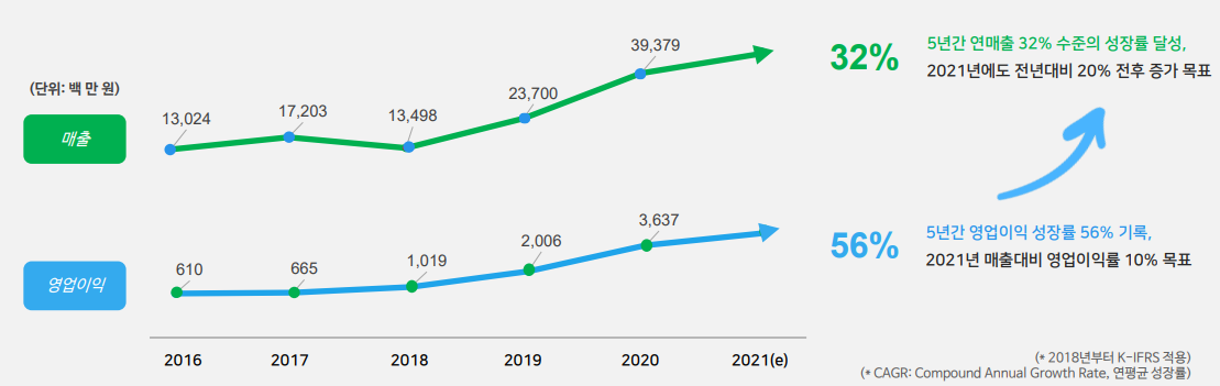 최근 5년 간 매출 및 영업이익의 연평균 성장률(*CAGR)이 각각 32%, 56% 증가한 가운데, 특히 2020년에는 코로나 상황에도 불구하고 매출 394억 원, 영업이익 36억 원을 돌파하며 지속적 성장을 이루었다. 플래티어는 2021년에도 경쟁이 치열한 디지털 플랫폼 솔루션 시장에서 신흥 강자로 자리매김 할 것으로 기대되고 있다.