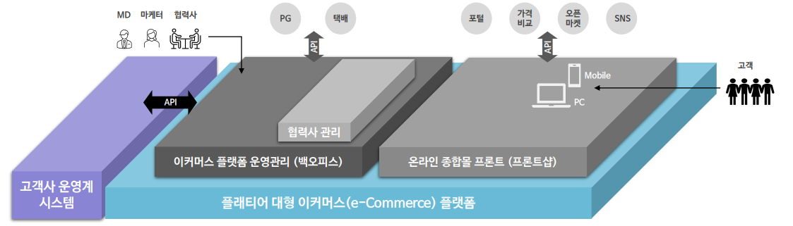 플래티어는 지금까지 90여 개 대기업 사이트의 170개 이상의 이커머스 플랫폼 구축 및 운영 프로젝트를 수행해왔다. 플래티어의 ‘이커머스 플랫폼’ 비즈니스는 다년간 축적된 노하우를 바탕으로 이커머스 사업의 A부터 Z까지 아우르는 ‘턴키 솔루션(Turn-Key Solution)’을 제공한다. 플래티어는 고객사의 비즈니스 도메인을 철저히 분석하여 최적의 솔루션을 제안하며 (컨설팅), 자체 솔루션을 활용한 시스템 구축 (설계/개발), 그리고 유지보수 및 개발운영까지 이커머스 비즈니스의 모든 과정을 종합적으로 제안/설계/ 관리하고 있다.