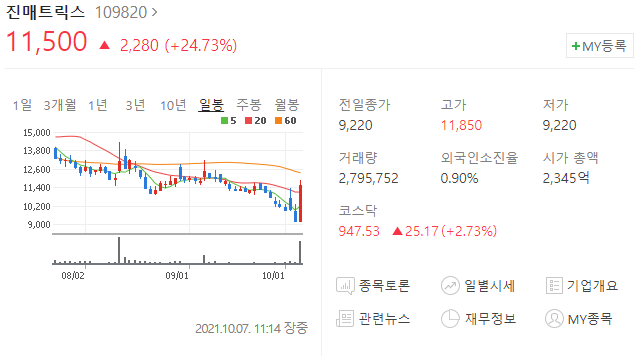 몇일동안 하락만 하던 진매트릭스 주가가 급등하고 있습니다.