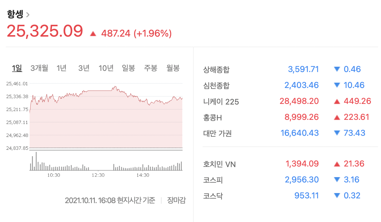 오늘 홍콩 항셍지수는 1.96% 상승한 25325.09(+487.24) 포인트를 기록해주었습니다.