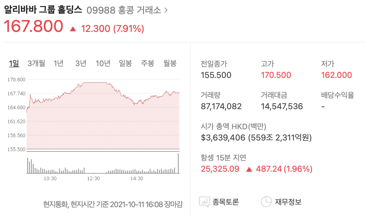 특히 한국 사람들이 많이 투자하고 있는 알리바바그룹홀딩스가 7.91%나 상승하였습니다.