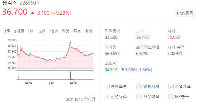 올릭스 주가가 중국 바이오 제약기업 한소제약과 siRNA 치료제 연구개발을 위한 라이선스 및 협력 계약을 체결한다는 소식에 오늘 같이 안 좋은 장에 9% 대나 상승하였다.