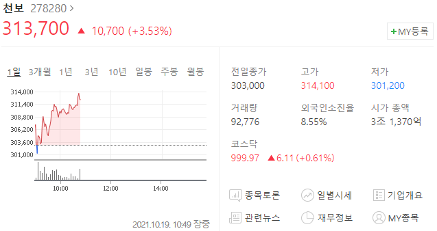 2차 전지 관련주 상승에 천보 주가 상승 중