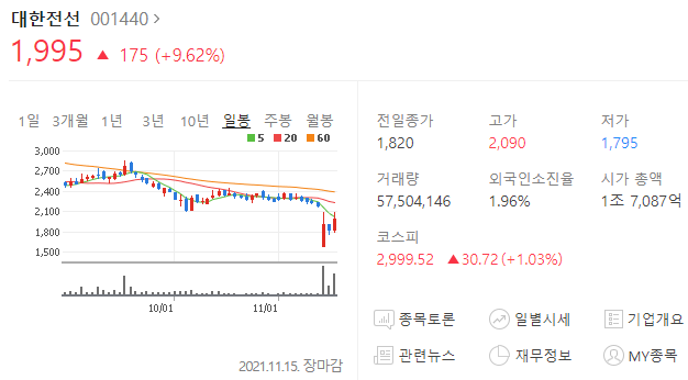 대한전선이 미국 서부 캘리포니아에서 약 600억 원 규모의 전력망 프로젝트를 수주했다는 소식에 급등한 것으로 밝혀졌다. 지난 9월 420억 원 규모의 초고압 전력망 프로젝트를 수주에 이어 또 600억 원 규모의 수주인 것이다.
